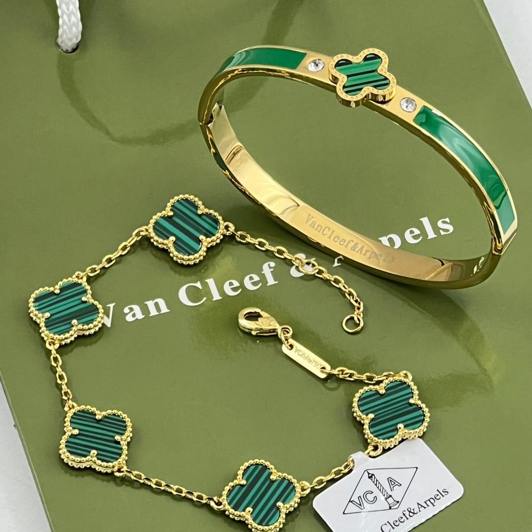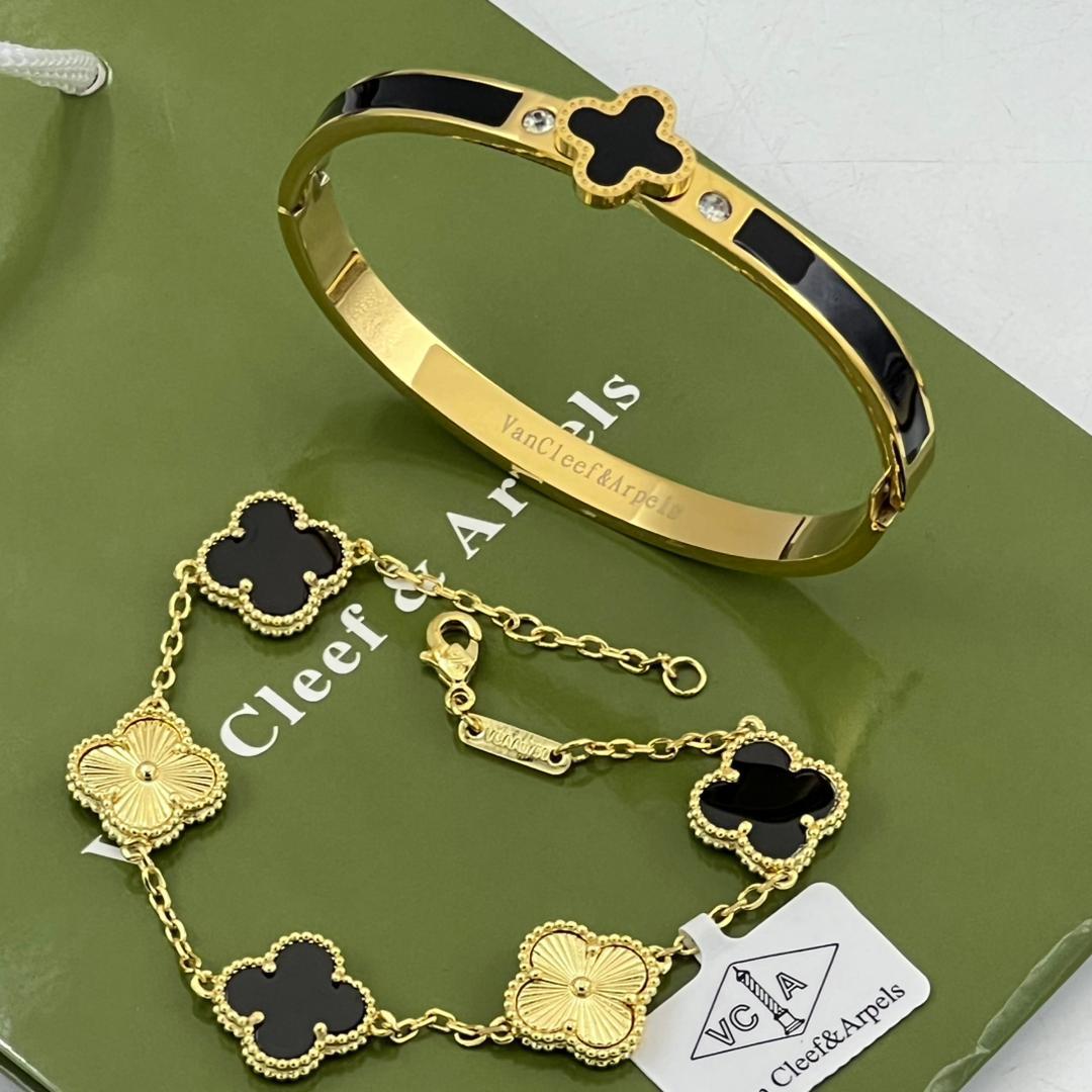 The “Power Stack”: Designed to be worn in pairs. The Structural Bangle features a secure side-hinge and an inlaid clover centerpiece, while the 5-Motif Chain Bracelet provides a fluid, delicate drape.