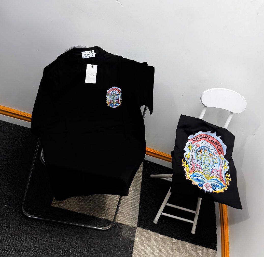 In our Idumota store, we curate for those who want their clothing to tell a story. Casablanca has defined the current era by merging high-end leisure with psychedelic art. This specific “Crest” design offers a level of visual depth rarely seen in streetwear; the vibrant oranges, blues, and reds create a “neon-stained glass” effect that pops with surgical precision.
