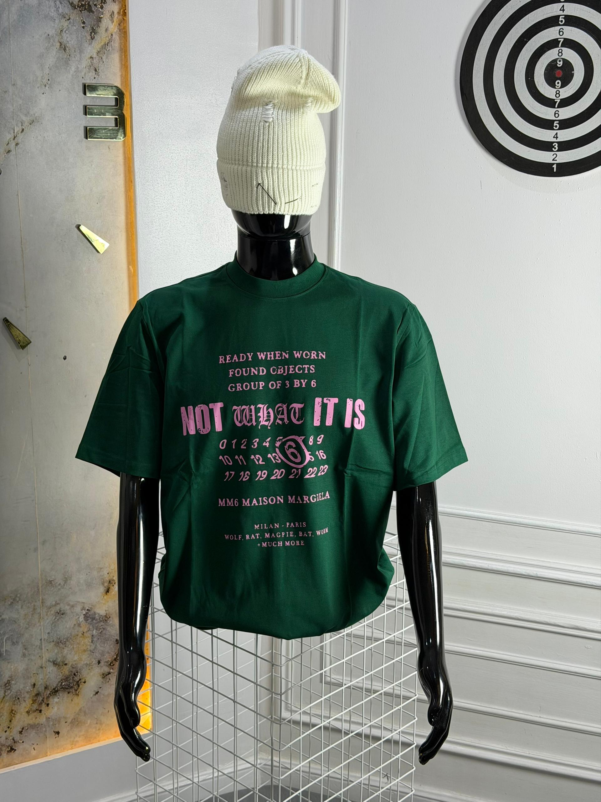 The “Maison” Aesthetic: A tribute to archival deconstruction, the graphic features a mix of bold block lettering, numeric sequences, and typewriter-style text. The contrast of the feminine pink against the masculine forest green creates an unmatched visual tension.