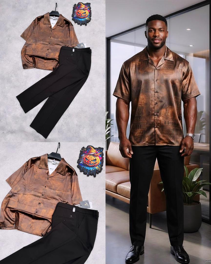 Step out in confidence with this bold 2-piece men’s outfit featuring a vintage newspaper print shirt paired with sleek black trousers. Designed for style, comfort, and versatility, this set effortlessly transitions from casual outings to smart occasions.