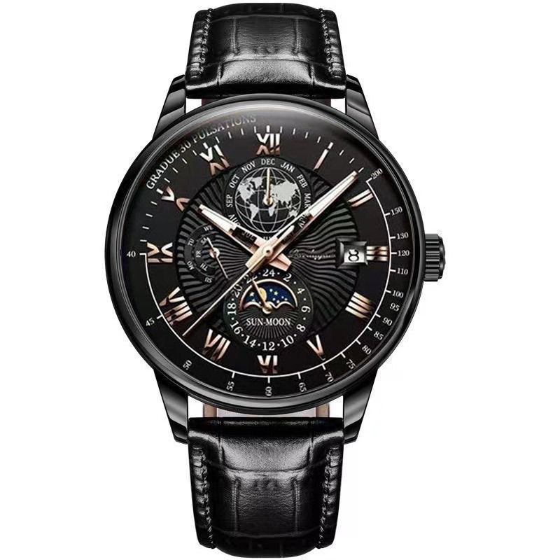 The Midnight Shadow: A full black-plated case and dial paired with a black leather strap. The ultimate choice for “Dark Luxury.”