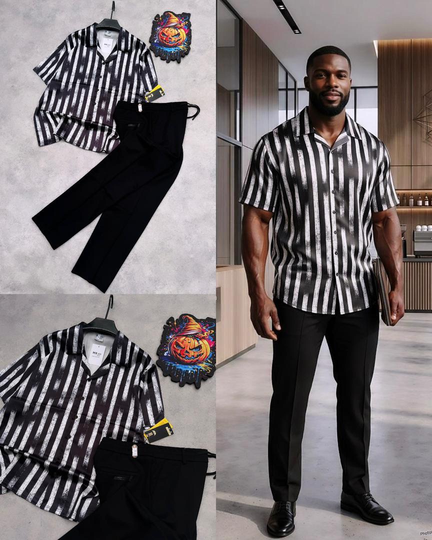Step out in confidence with this bold 2-piece men’s outfit featuring a vintage newspaper print shirt paired with sleek black trousers. Designed for style, comfort, and versatility, this set effortlessly transitions from casual outings to smart occasions.