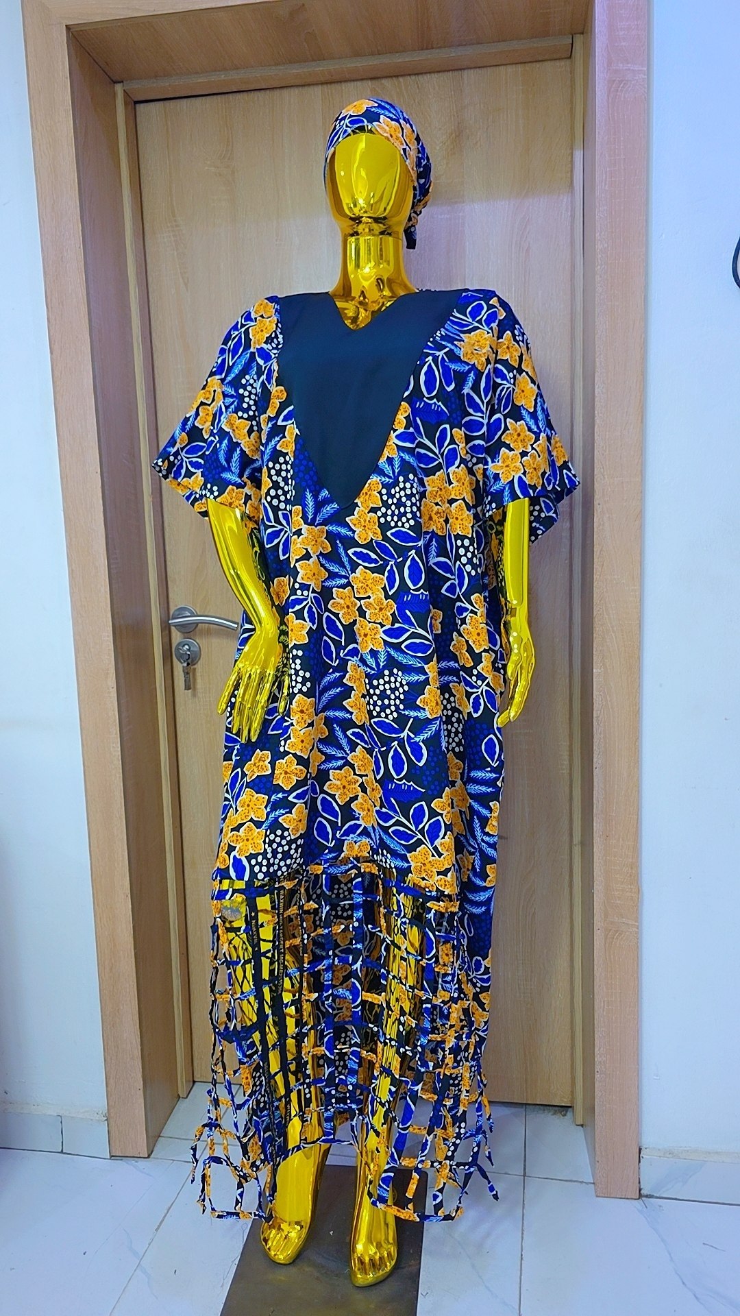 The 2026 “Afro-Futurist” Aesthetic In our boutique, the 2026 season is defined by “Structural Dominance.” The Sapphire-Solar Bubu discards standard, flat traditional wear for a piece of wearable engineering that balances organic floral motifs with a sharp, industrial lattice hem. It is the definitive move for the woman who wants her presence to signal high-fashion IQ and unshakeable confidence, pairing flawlessly with our Gold-Crest “Empire” Sandals.