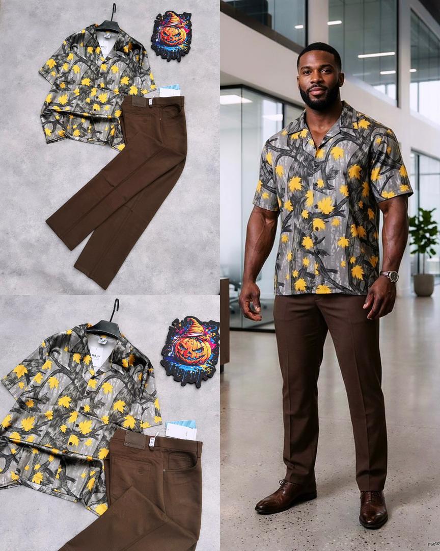 Step out in confidence with this bold 2-piece men’s outfit featuring a vintage newspaper print shirt paired with sleek black trousers. Designed for style, comfort, and versatility, this set effortlessly transitions from casual outings to smart occasions.